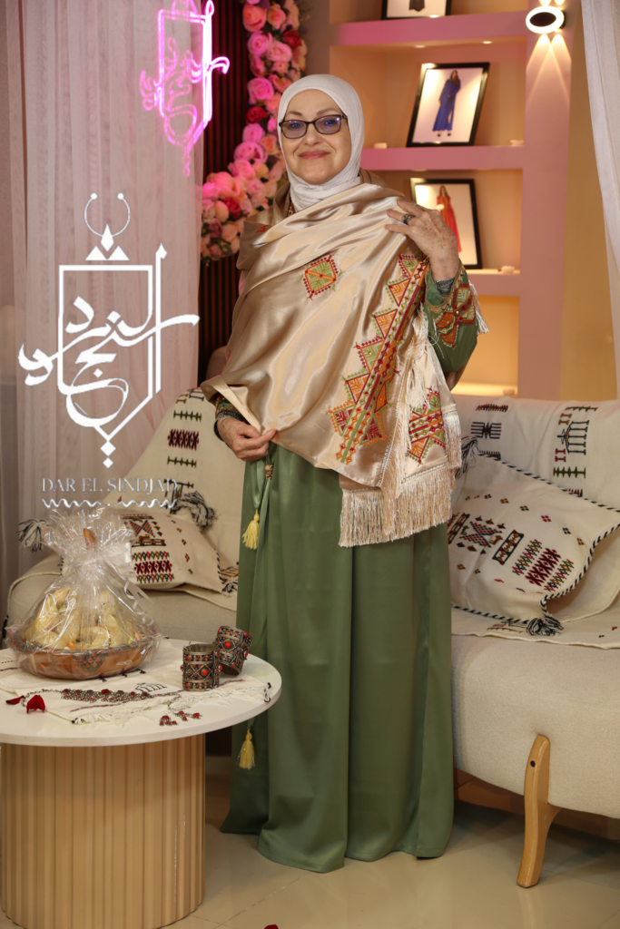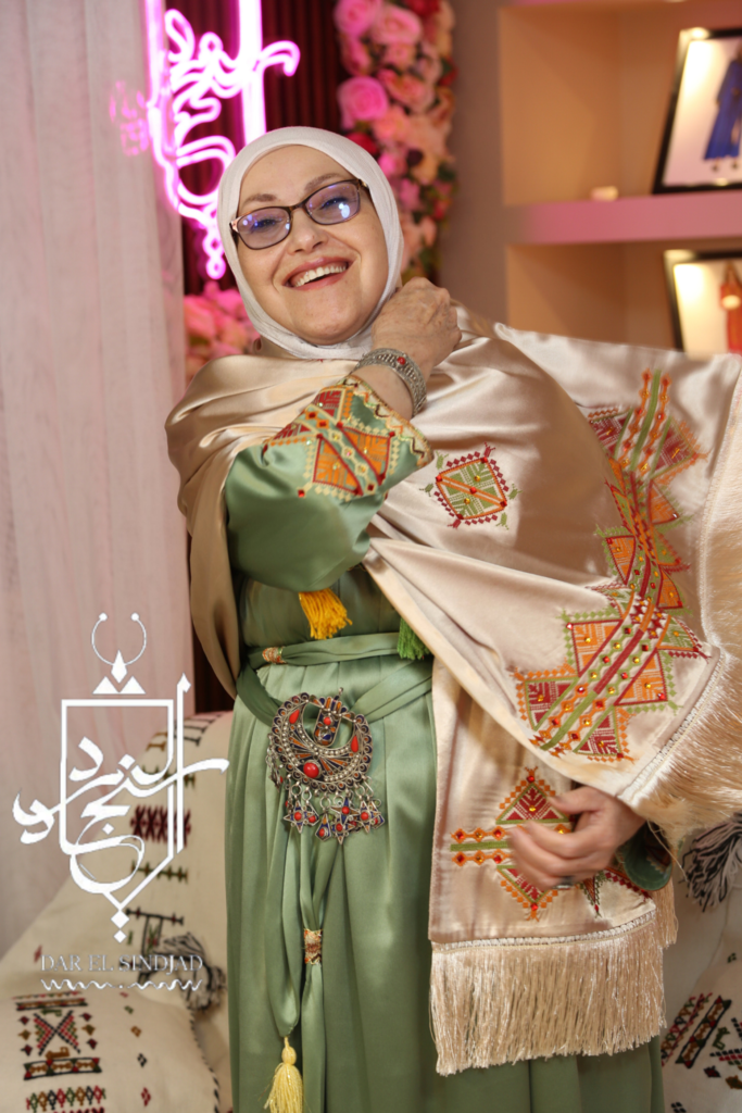 The Algerian "BALITA" is a distinctive and unique piece that reflects the culture of the country and the charm of traditional designs. It features an elegant and luxurious design, with a soft beige color complemented by touches of pink embroidery, adding a touch of femininity and allure. The incorporation of gemstones adds a sparkle and charm to the design, making it eye-catching and enhancing its splendor. This "BALITA" serves as a perfect accessory for the modern woman seeking a luxurious and elegant touch to complete her look, especially for weddings, special occasions, and celebrations.