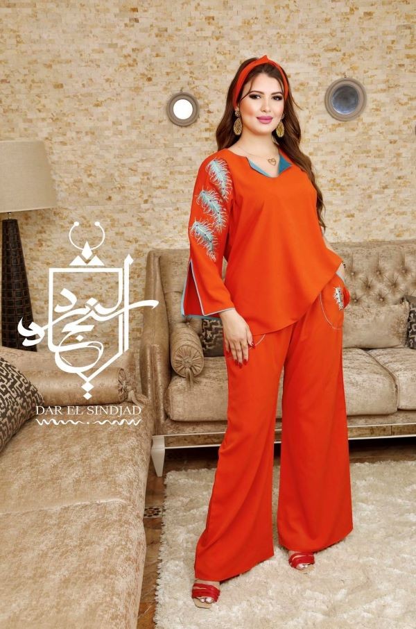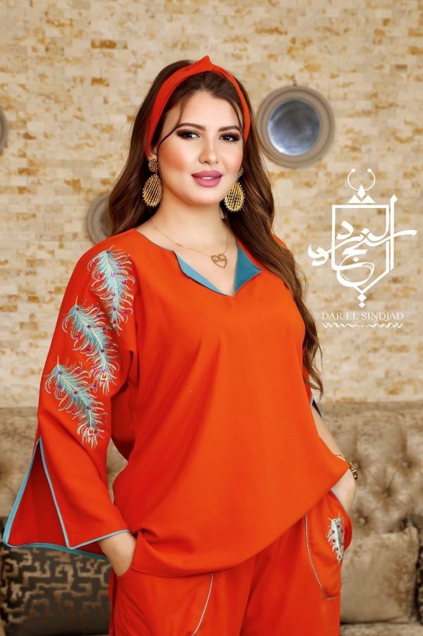Two harmonious pieces that reflect elegance. The 1st piece has a distinctive and high quality design, the finest fabrics and materials are used to create an elegant shirt in orange color and embellished with innovative feather details that add a touch of luxury and beauty