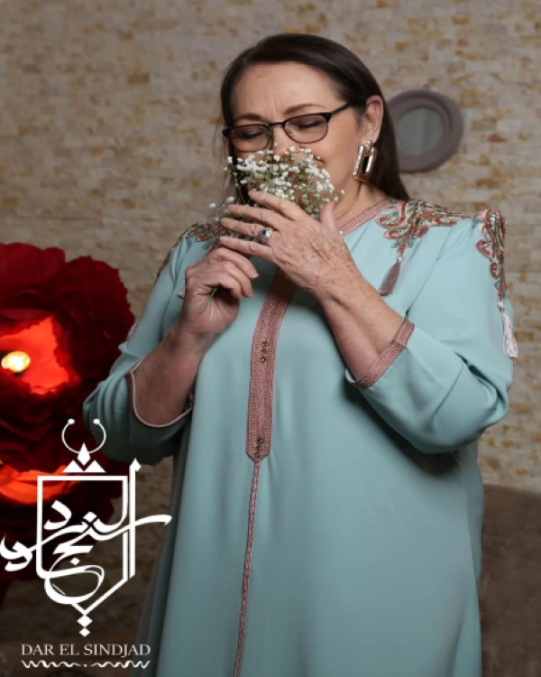 A Dress specially designed for mothers seeking a unique and elegant look. Its custom design allows mothers to enjoy both elegance and comfort at the same time. The cut is characterized by sophistication and modesty, giving the light green gown a refined and conservative appearance. It features distinctive details such as the embellished collar, adding a touch of authenticity and luxury.