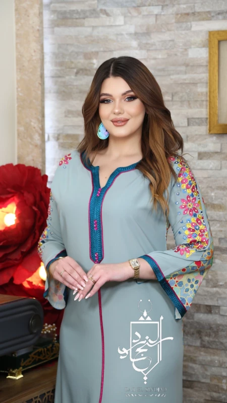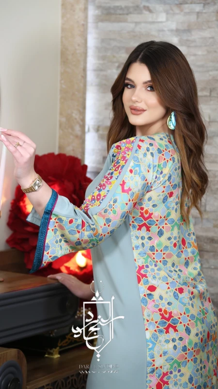 A dress from the new 'Nawaem' collection made of soft crepe. The design features a solid-colored front half and a back half adorned with Algerian zellige patterns, embellished with embroidery and stones. The colors are carefully chosen to align with the latest fashion trends.